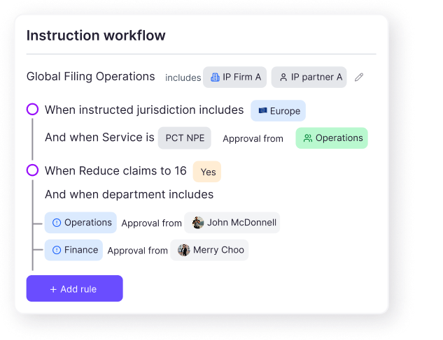 Execute PCT national phases, EP validations, and direct filings worldwide from a single dashboard.